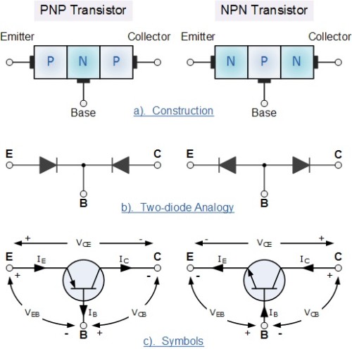 Tranzistorii sunt alcătuiți din trei terminale active realizate din materiale semiconductoare diferite (în general siliciu, mai rar germaniu, dar nu numai..), care pot funcționa fie ca izolator, fie ca un conductor prin aplicarea unei tensiuni de semnal mic. Aceste trei terminale sunt cunoscute și etichetate ca Emitor ( E ), Baza ( B ) și Colector ( C ). Tehnologia de realizare diferă în funcție de tipul tranzistorului dorit. De exemplu, un tranzistor de tip PNP se realizează pe un substrat de tip P, în care se creează prin diferite metode (difuzie, de exemplu) o zona de tip N, care va constitui baza tranzistorului.